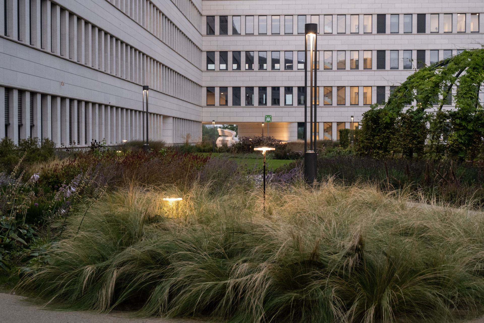 Statt einer flächigen Ausleuchtung setzt die Planung auf ein nuanciertes Spiel aus Licht und Schatten. Die Mastleuchte „Tris“ von Platek strukturiert die größeren Plätze nicht nur durch Helligkeit, sondern projiziert durch ihre dreistrebige Konstruktion ein grafisches Schattenspiel auf den Boden, das die Strenge der Architektur bricht. Für die Wegeführung sorgen „Moon“-Pollerleuchten: Ihre leuchtende, kreisrunde Silhouette bietet eine sanfte, blendfreie Orientierung und hellt zugleich rückwärtig die angrenzende Bepflanzung subtil auf. Besondere Akzente setzen die filigranen „Chiodo“-Glasstäbe in den Beeten. Sie wirken wie leuchtende Schilfhalme und inszenieren Gräser und Stauden so, dass selbst im Wind ein dynamisches, belebtes Bild entsteht – der Außenraum wird zur lebendigen Kulisse.